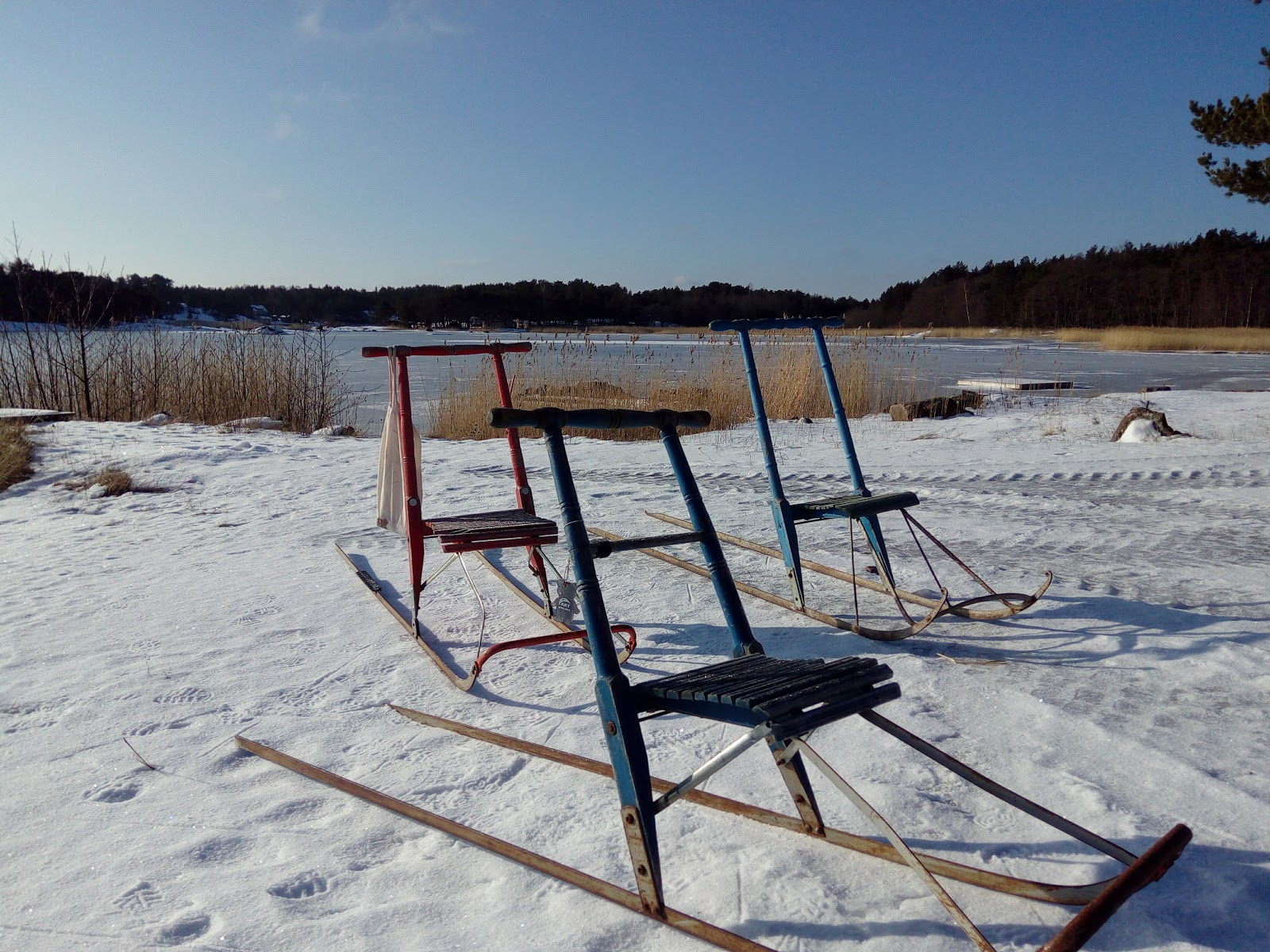 Onneksi potkukelkkoja löytyy vintiltä ihan joka kokoa ja pienelle joukkueelle asti, sillä nyt oli liukkaat kelit ja kimaltelevat hanget matkalla tuttuun venerantaan. Kesäisin pyöräilemme sinne yhdessä hujauksessa, mutta ei se potkutellenkaan kauaa vienyt. Piti vain välillä pysähtyä ihastelemaan pellon yli pinkovia peuroja ja kimaltelevaa luontoa. Ihan joka talvi ei tällaisia kelejä suoda tänne saaristoon, siksi onkin nautittu täysin siemauksin!